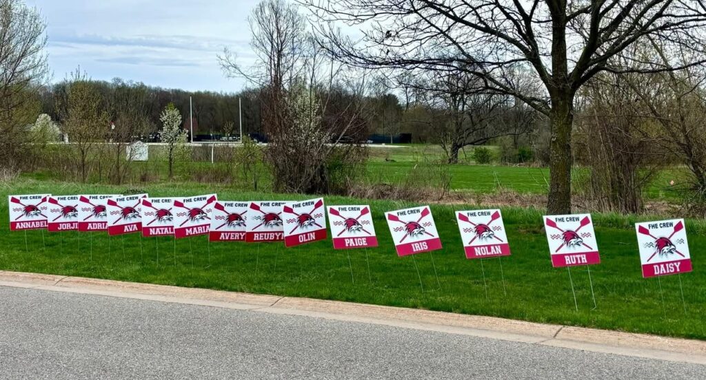 Yard signs may be purchased for $25. These are double sided signs with your rower’s name and displayed at FHE during Regatta weeks. Additional signs can also be purchased for home use. *Returning rowers that have purchased a sign in the past do not need to reorder – we have it! This would be for any athlete that has not ordered previously. Please add the $25 per sign fee to your dues payment.